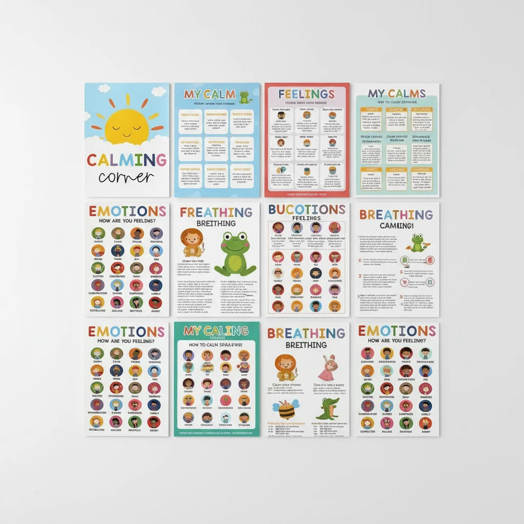 Our set combines a dedicated 'Calming Corner' concept with a comprehensive 'Feelings Wheel' and 'Emotions' chart, offering a holistic approach. The cheerful, engaging designs make learning about emotions fun and non-intimidating, setting them apart as a superior educational tool.
